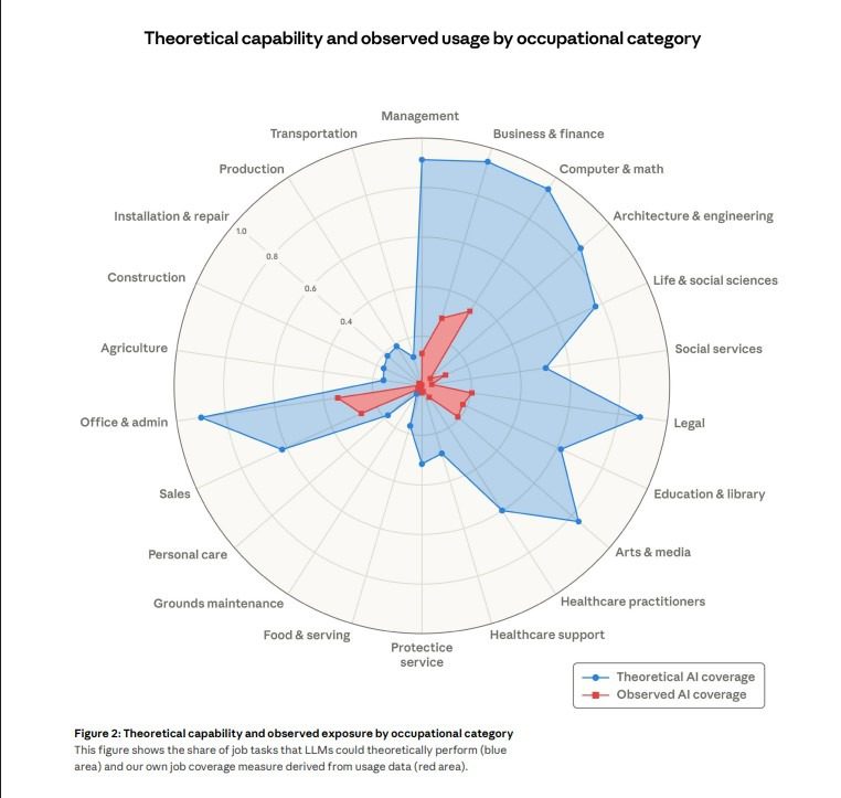 2. However, actual AI usage is far lower than theoretical capability across most professions.
