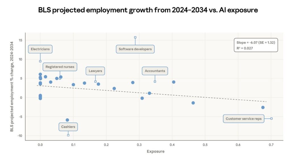 Relationship between AI exposure in occupations and future employment growth projections by the U.S. Bureau of Labor Statistics (BLS).