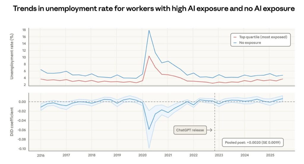 3. The analysis finds no statistically significant increase in unemployment for highly AI-exposed workers.