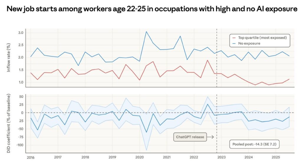 1. Since around 2024, hiring into high-AI-exposure jobs has slowed slightly for young workers.