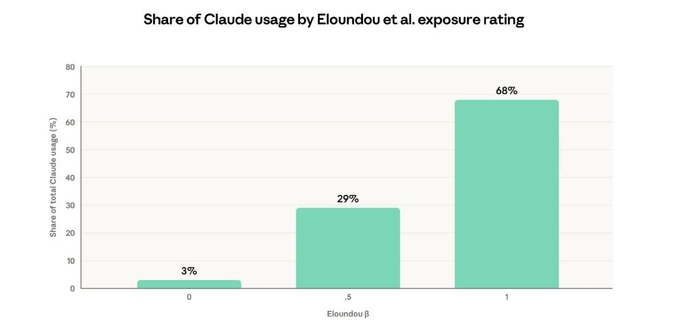 1. Around 68% of Claude’s usage occurs in tasks that AI can fully perform alone (β = 1), meaning these tasks can theoretically be automated using LLMs.